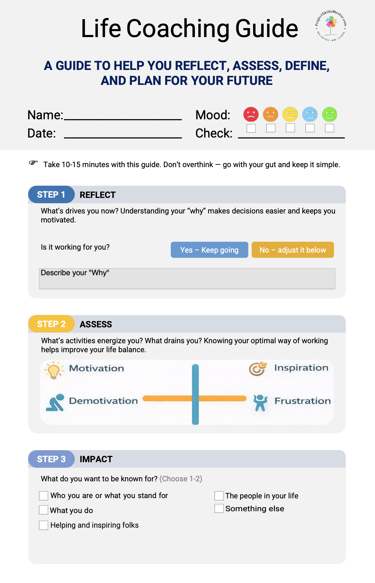 I’ve created an updated Life Coaching PDF—now fillable and expanded to include the Values Bridge. Alongside the Life Wheel and a guide to finding your “Why”, it brings everything together into one simple, practical process.