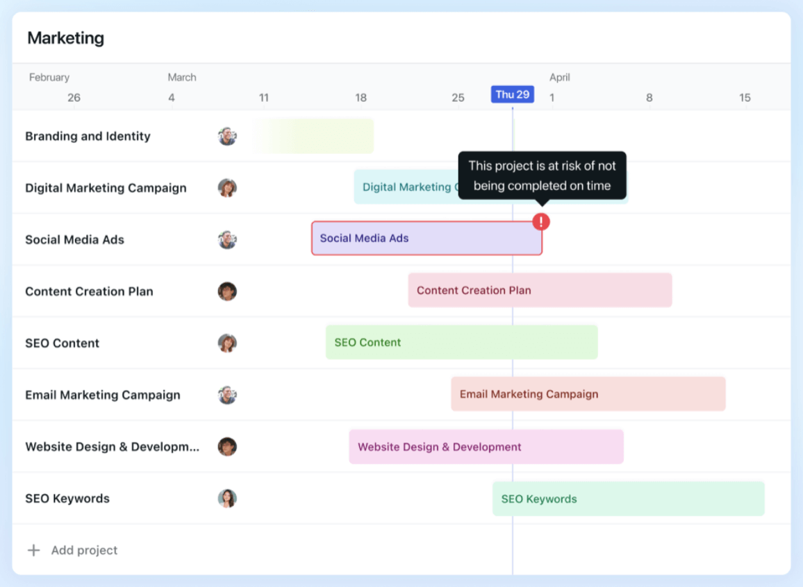 Timeline and dependency tracking. Asana supports Gantt-style timeline views, helping project managers identify sequencing risks.
