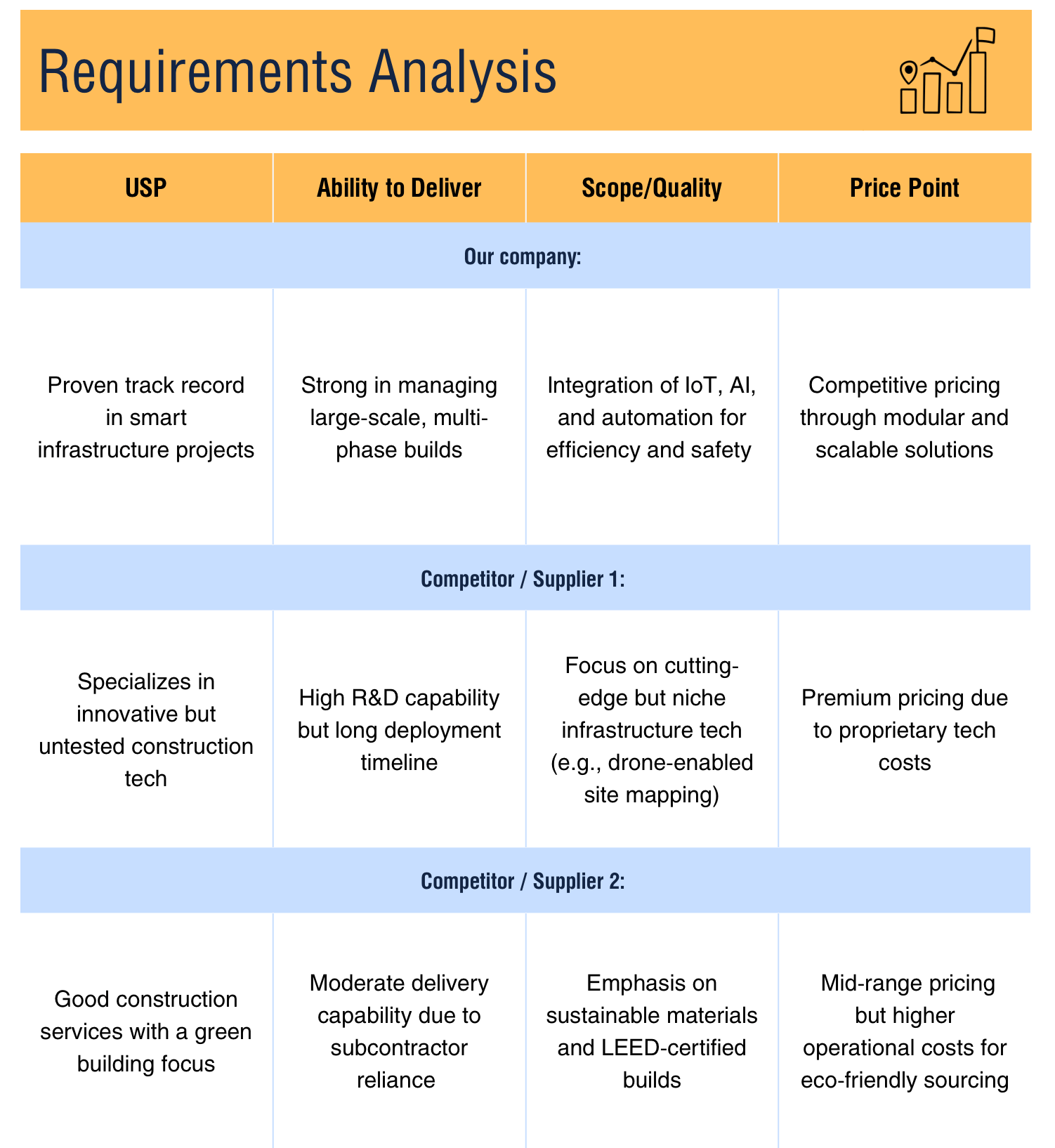 This section helps you compare your needs to those of your competitors on a level playing field. This information gives you an edge to make fact-based trade-offs during discussions.