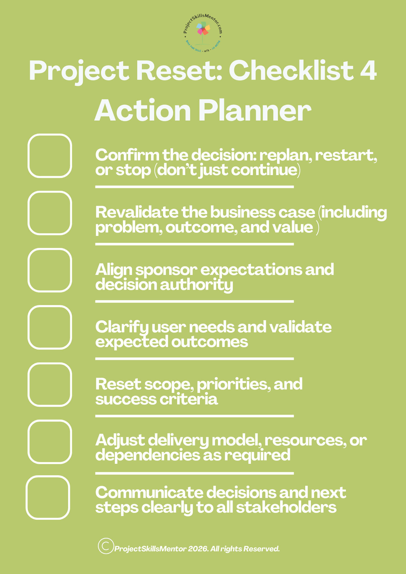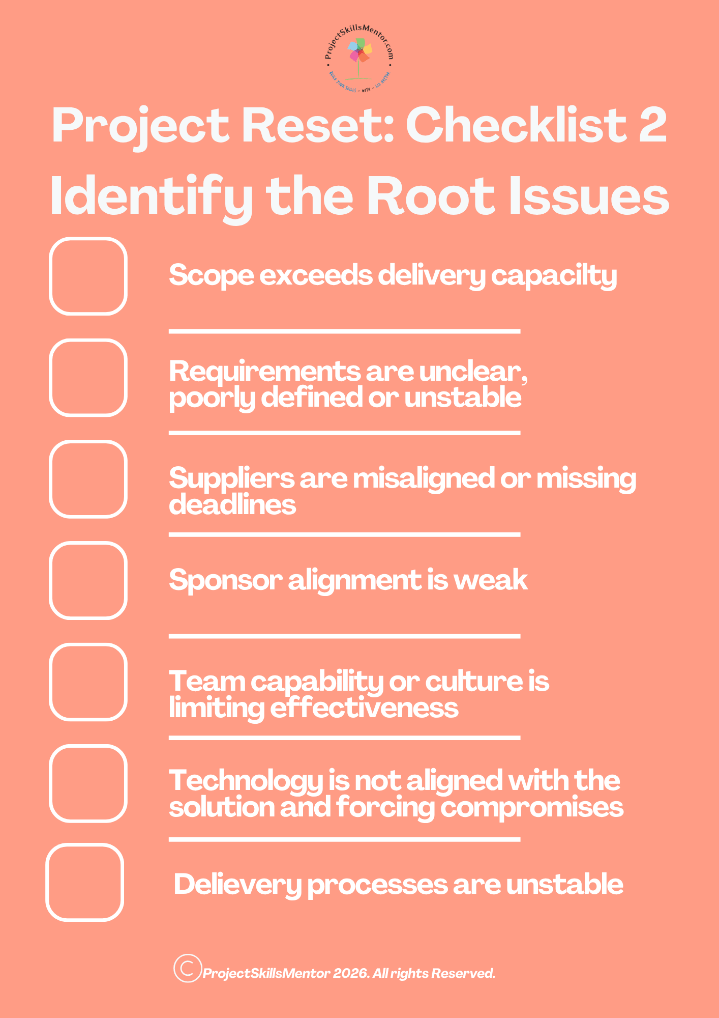 Use this checklist to selectively focus on actions that will fix the root causes and allow you to make the right decision about the future of the project.