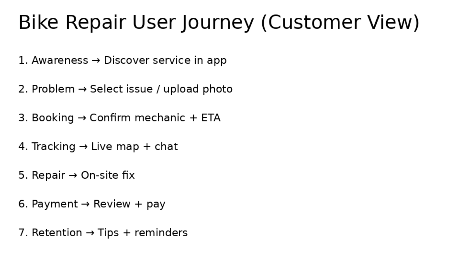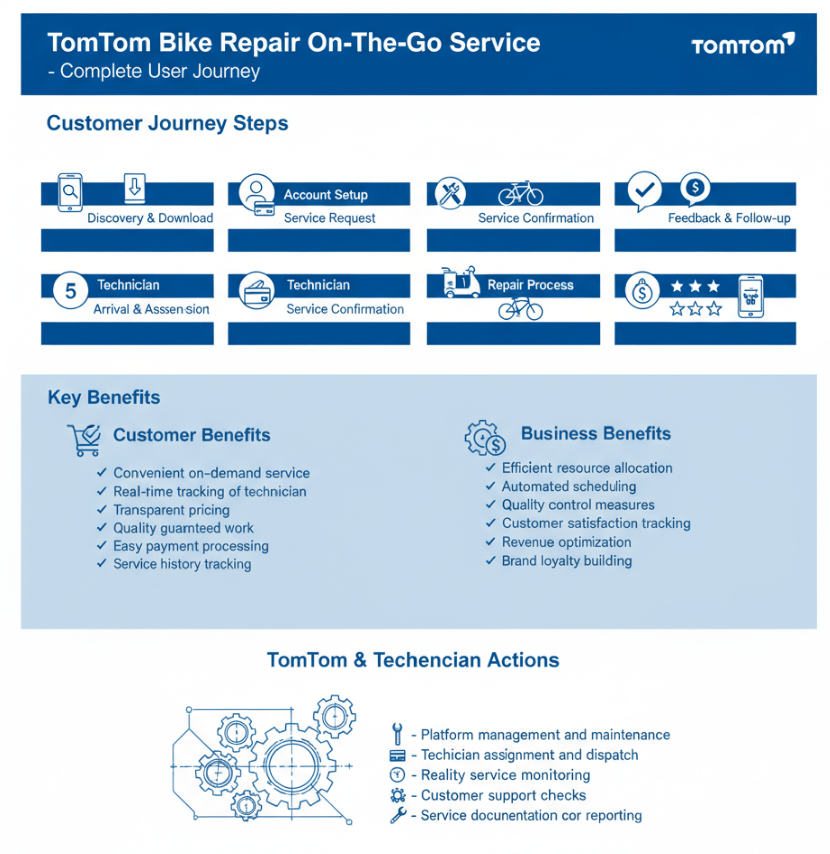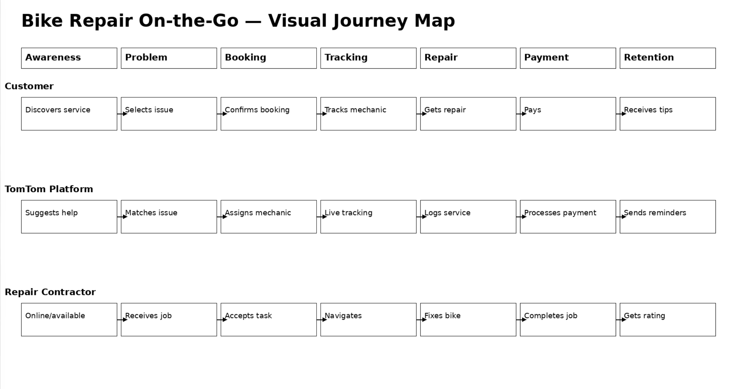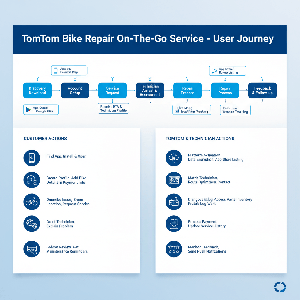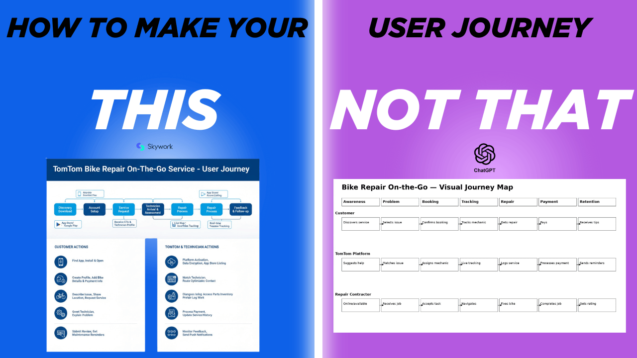 I worked with two tools, the paid versions of ChatGPT and Skywork.ai, to generate a user journey map for TomTom’s bike repair on-the-go service. Reviewing both outputs side by side makes the differences in approach immediately apparent. ChatGPT, as a general-purpose AI, produced a structured but relatively basic journey—clear, logical, and text-driven, but lacking the visual hierarchy, design language, and storytelling expected in a professional UX deliverable. In contrast, Skywork.ai generated a more polished and presentation-ready artifact, with stronger visual flow, iconography, and a clearer sense of how the journey would be consumed by stakeholders.